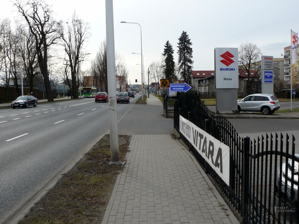 Docieramy do ronda Stefana Batorego, a za Wami już ponad 3 km trasy. Na rondzie prosto przez kilka rzędów pasów, gdzie radze zwolnić. Choć biegam tam często, to równie często trafiam tam na zaskoczonych biegaczem kierowców. Za rondem cały czas prosto w kierunku Przylepu. Na początku tej około 2 km prostej traficie na fragment chodnika, którego wzór potrafi nieźle w głowie namieszać. Wystarczy, że biegnąc odpowiednio się na niego popatrzycie.