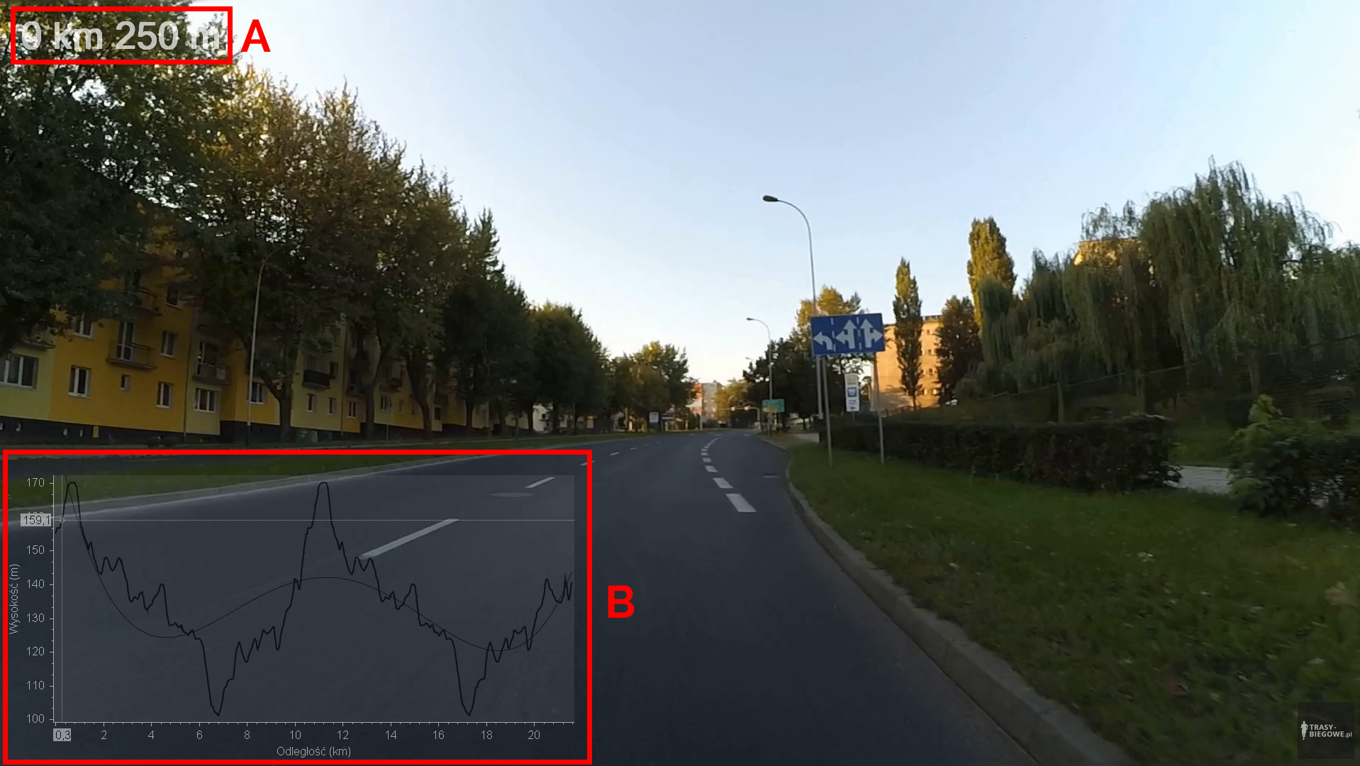 Wideo prezentacja: Odległość i profil trasyKażda z przygotowywanych przez nad wideo prezentacji zawiera trzy elementy. Pierwszym z nich jest sama trasa. Pozostałymi dwoma jest licznik odległości (A), więc w każdej chwili możecie zorientować się który kilometr trasy obserwujecie oraz profil trasy (B), który pomoże w dobraniu taktyki biegu.
