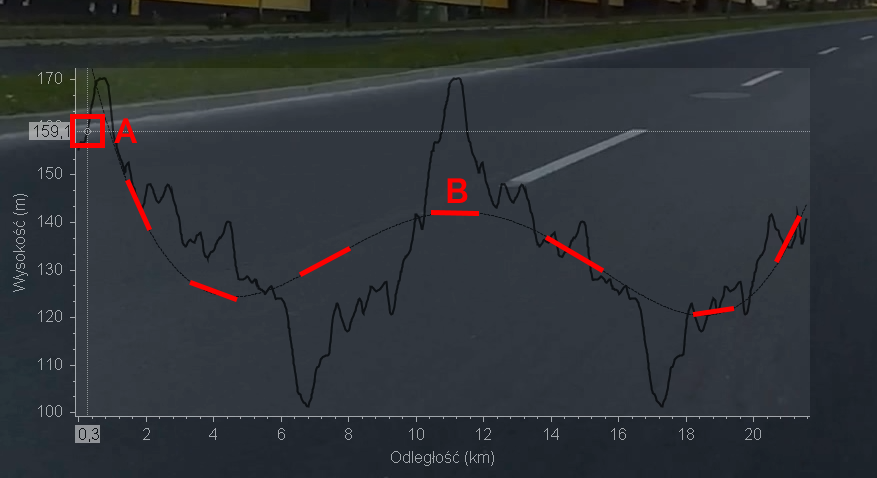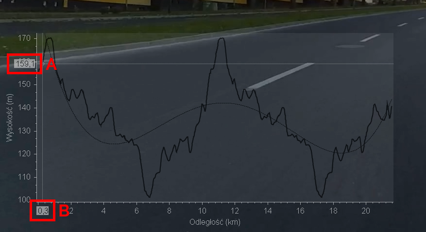 Wideo prezentacja: Wysokość i odległośćSam wykres profilu trasy, który przygotowaliśmy w oparciu o rzeczywiste odczyty Zawiera wskaźnik wysokości oznaczony literą A oraz wskaźnik aktualnej odległości (B).