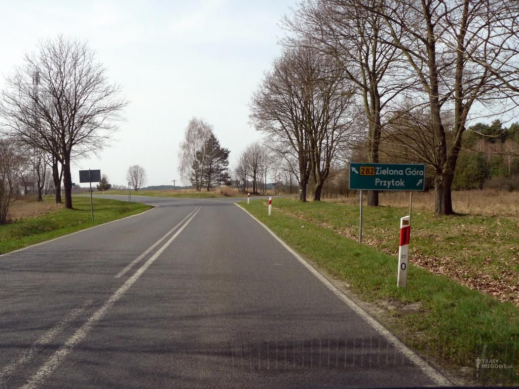 Trasa zaczyna swój bieg w parku pałacowym przy ośrodku szkolno-wychowawczym w Przytoku. Pierwsze niecałe 4 kilometry trasy biegnie prosto. Gdybym miał krótko opisać całą trasę napisał bym, że poza kilkoma wyjątkami gdzie należy skręcić trzymać należy się głównej drogi.Trasy biegowe: XIV półmaraton Przytok, Przytok, woj. Lubuskie Początek trasy to ul. Lubuska oraz podbieg, który kończy się w okolicach zabudowań w Łazach. Chwile po tym jak miniecie znak, trasa prostuje się i zaczyna lekko opadać zbliżając się do pierwszego zakrętu. Cały czas kierujcie się prosto, a gdy traficie na skrzyżowanie skręćcie w prawo w kierunku Droszkowa (droga 282 kierunek Zielona Góra). Ze skrzyżowania do Droszkowa jest około 1 km, a na trasie znajdziecie kolejne dwa niewielkie podbiegi. Trasy biegowe: XIV półmaraton Przytok, Przytok, woj. LubuskieW Droszkowie trzymajcie się głównej drogi, a gdy dobiegniecie do pierwszego skrzyżowania skręćcie w lewo na Czarną. To już 10 km więc prawie połowa trasy za Wami. W tym miejscu droga asfaltowa nieco się zwęża co pewnie zmusi Was do biegu poboczem wzdłuż ul. Dębowej po chodniku wykonanym z kostki brukowej. Kolejny raz macie przez sobą podbieg. W okolicach oznaczenia końca Droszkowa trasa znowu zaczyna opadać dając Wam możliwość puszczenia nóg i złapania oddechu. Trasy biegowe: XIV półmaraton Przytok, Przytok, woj. LubuskieMyślę, że te długie proste odcinki trasy i podbiegi to najbardziej charakterystyczne cechy półmaratonu w Przytoku. Za Droszkowem pojawia się również asfalt gorszej jakości więc dla wszystkich tych z Was, którzy jak ninja lubią zbierać nierówności z asfaltu proponuje mocniej skupić się na nawierzchni przed sobą. Po długiej prostej w końcu pojawia się pierwszy zakręt w lewo oznajmiający zbliżanie się do Czarnej. Kilka set metrów dalej w czarnej skręćcie w lewo. Znak w czarnej poinformuje Was o dystansie do Zaboru i będzie to około 5 km, a Wy kolejny raz prostą ścieżką będziecie powoli zbliżać się do mety. Trasy biegowe: XIV półmaraton Przytok, Przytok, woj. LubuskiePrzyznam, że kolejną zaletą tej trasy jest to, że większy jej przebieg idzie przez lasy. Dla tych z Was, którzy lubią wybiegać się w weekendy na pewno przyda się informacja, że trasa między Droszkowem a Zaborem nie jest mocno odwiedzana przez samochody wiec można tam skupić się na biegu, a nie uciekać bez przerwy przed mijającymi nas pojazdami. Kolejną zaletą jaką zauważyłem jest cień. Duża część trasy to wysokie drzewa i wąskie drogi, które pozwolą Wam się ukryć. Wiem co powiecie „każdemu przyda się odrobina słońca”, lecz gdy na zawodach lub mocnym treningu biegniemy w szaleńczym tempie, a bidon z wodą jest już prawie suchy słońce i temperatura to ostatnia rzecz o jakiej marzymy. W czasie zbliżania się do Zaboru, drzewa jednak ustępują zabudowaniom oraz polom a zmianę temperatury na wyższą da się zdecydowanie wyczuć. Na końcu ulicy Chłapowskiego skręćcie w lewo kierując się w stronę Zielonej Góry. Trasy biegowe: XIV półmaraton Przytok, Przytok, woj. LubuskieMijając kościół  przed sobą zobaczycie kolejną prostą i kolejny podbieg na trasie.  W końcu jesteście na najciekawszym odcinku trasy, bo tutaj właśnie powoli zaczyna się podbieg pod Łazy. Koniec podbiegu wyznaczy Wam znak końcowy miejscowości. Jesteście na około 16 kilometrze trasy. Przed Wami już ostatnie kilka tysięcy metrów. Za miejscowością Łaz ponownie skręćcie w prawo kierując się w drogę, z której na początku trasy skręcaliście w prawo w kierunku Droszkowa. Trasy biegowe: XIV półmaraton Przytok, Przytok, woj. LubuskieDo mety biegnie się zdecydowanie lepiej. Na pewno jesteście dogrzani, więc jeśli całego glikogenu nie zostawiliście na podbiegu w Łazach to tutaj na odległości około 18 km warto go wykorzystać. Trasa zaczyna opadać, a Wy będziecie mogli odzyskać czas stracony na podbiegach. Warto pamiętać, że gdy odbywają się zawody dobiegając do ośrodka nie skręcacie od razu w lewo. Przebiec należy jeszcze kilka set metrów do przodu a po ostrym nawrocie ponownie tą samą ulicą biegnijcie w kierunku mety w parku pałacowym.